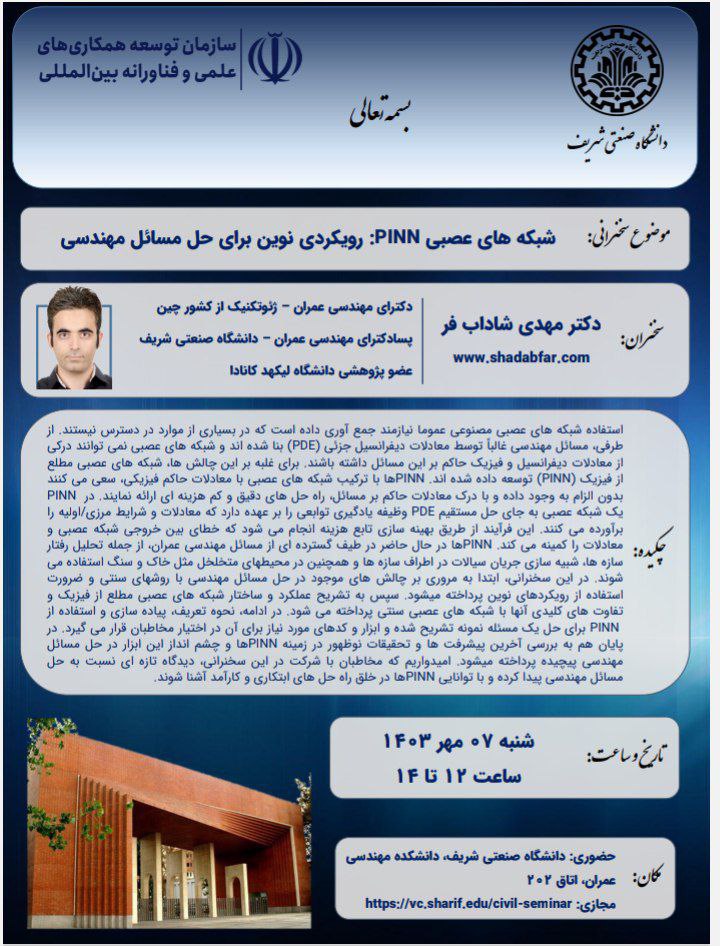سخنرانی علمی سخنرانی علمی در دانشکده مهندسی عمران روز شنبه، هفتم مهر، سخنرانی علمی با موضوع "شبکههای عصبی PINN: رویکردی نوین برای حل مسائل مهندسی" توسط آقای دکتر مهدی شادابفر عضو پژوهشی دانشگاه...