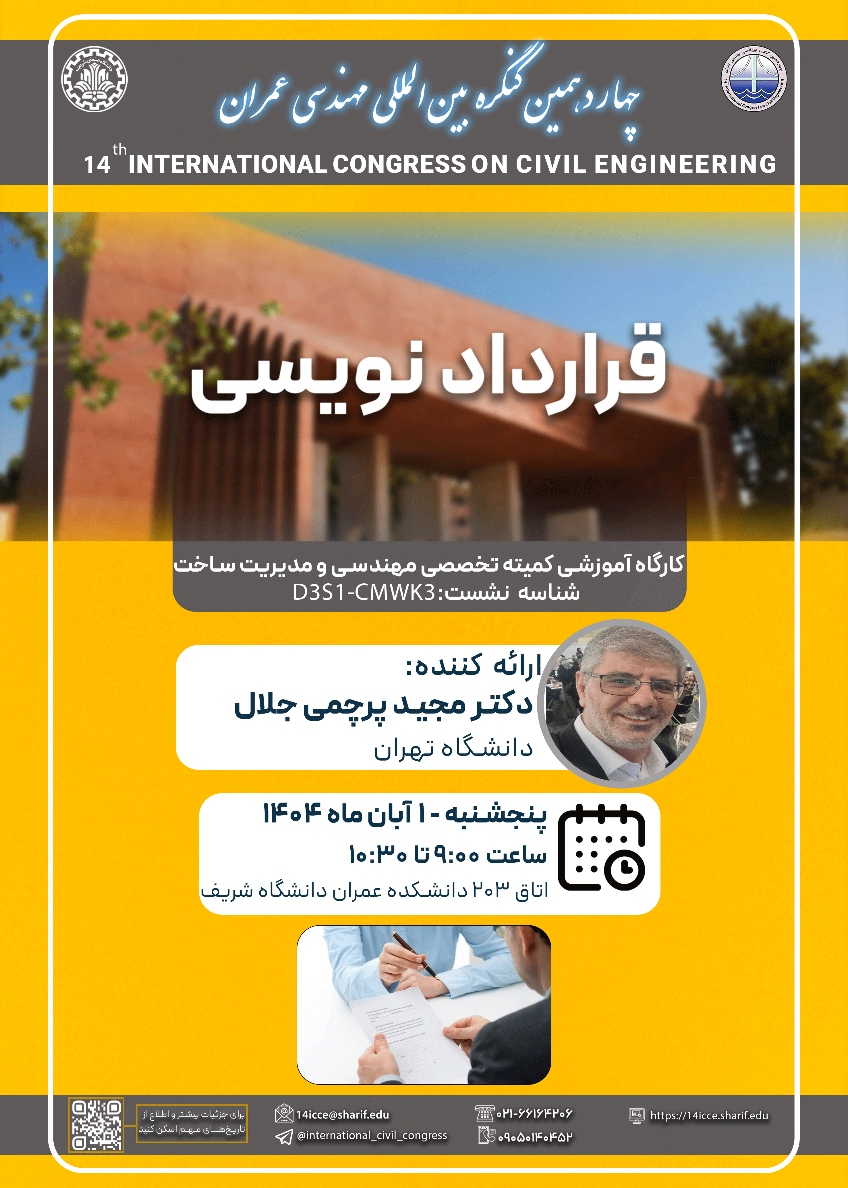 Expert Workshop on Contract Drafting Contract Drafting Presenter: Dr. Majid Parchami Jalal – University of Tehran 📆 October 23, 2025 ⏰ 09:00 – 10:30 📍 Room 203, Faculty of Civil Engineering 🔗...